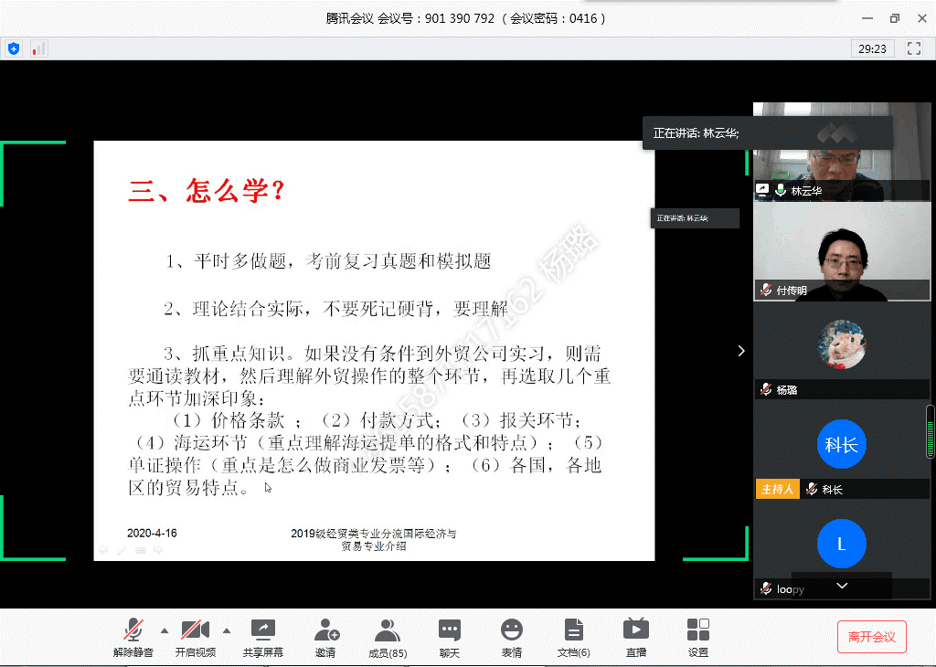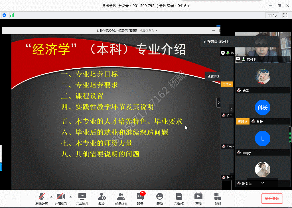 (通讯员:杨璐)疫情期间,为保证2019级本科学生专业分流工作的稳步推进,让各位同学对选报专业有更清楚的认识,法商学院于4月16日下午通过腾讯会议平台组织开展了“2019级专业分流线上宣讲会”,法商学院院长金明浩、副书记严敏、院长助理付书科、经济学教研室主任张艳、国际经济与贸易教研室主任付传明、经济学教研室韩可卫教授、国际经济与贸易教研室林云华、周灏教授、部分班主任和19级全体经贸大类同学参加了此次会议。